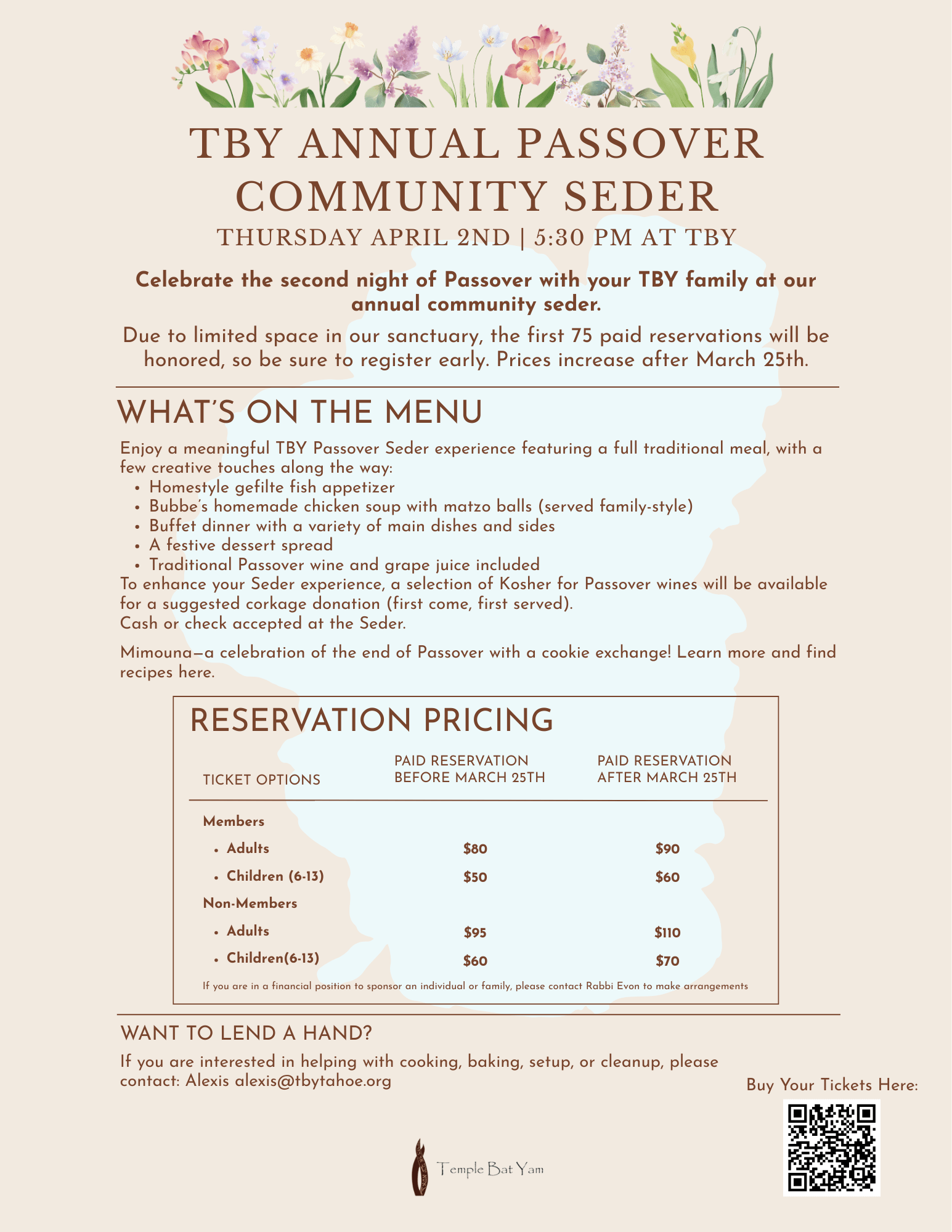 April 9 @ 5:00 pm - 7:00 pm TBY: Mimouna Temple Bat Yam 3260 Pioneer Trail, South Lake Tahoe, CA, United States TBY