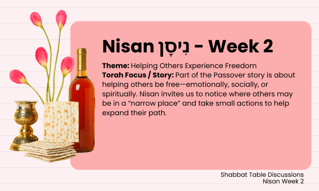As the month of Nisan continues, the story of Passover reminds us that freedom is not only personal — it is communal. The Exodus from Egypt is told as the journey of an entire people, not just individuals. No one leaves alone. Families, neighbors, and strangers all walk together toward liberation. Because of this, the season of Passover asks us not only to reflect on our own freedom, but also to notice where we can help others feel less alone, less burdened, and more able to move forward.